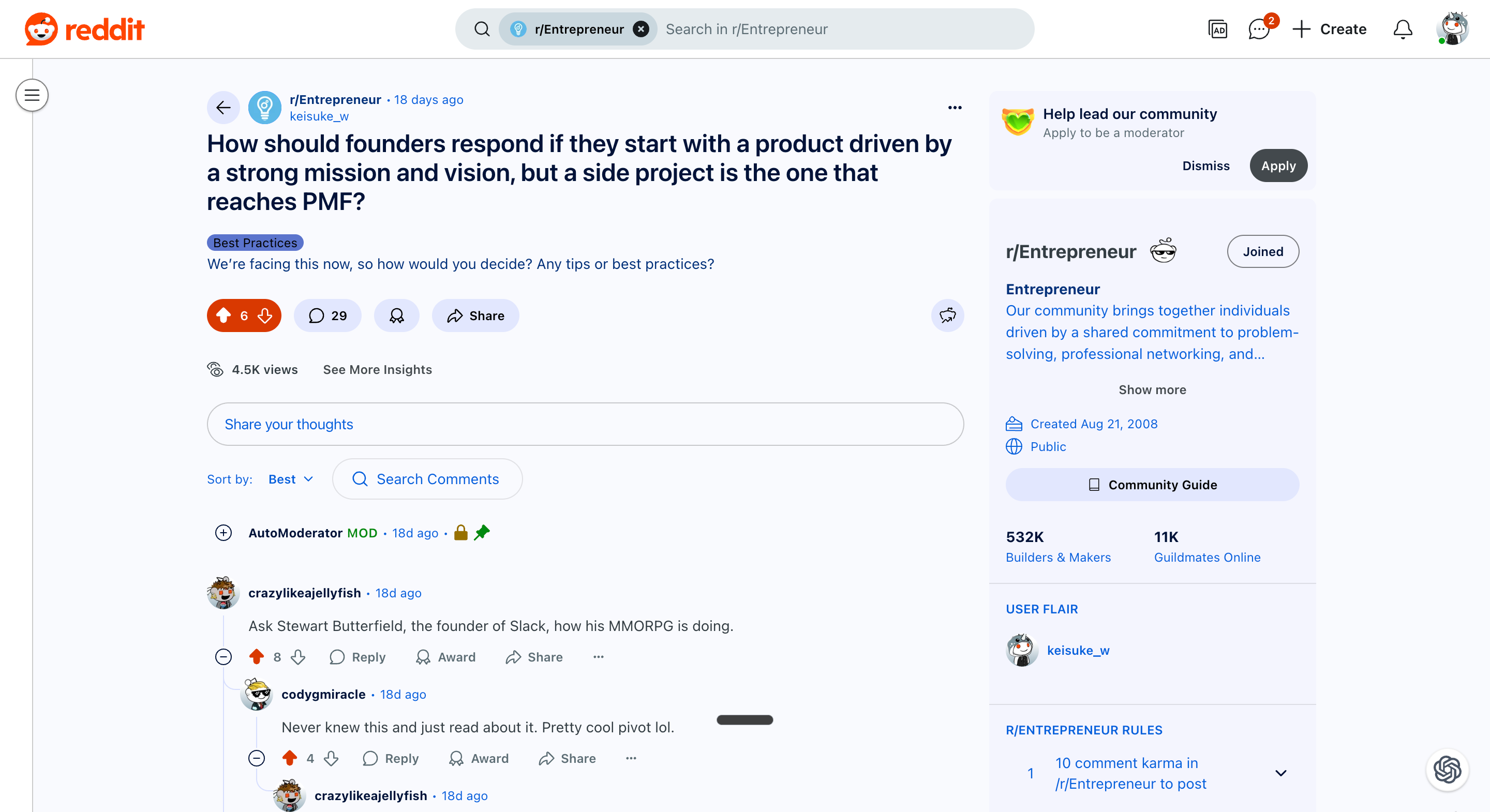 We didn’t have an easy answer. So, we asked around — founders, growth experts, even . We also took the discussion to Reddit, where it resonated deeply. Dozens of entrepreneurs shared their own stories, lessons, and frameworks for deciding between mission and market pull.