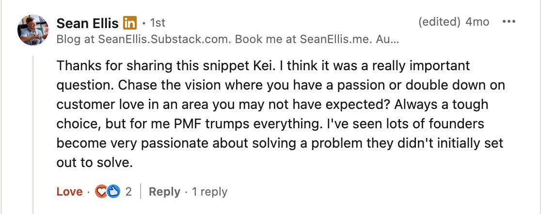 “Chase the vision where you have a passion or double down on customer love in an area you may not have expected? Always a tough choice, but for me PMF trumps everything. I’ve seen lots of founders become very passionate about solving a problem they didn’t initially set out to solve.”