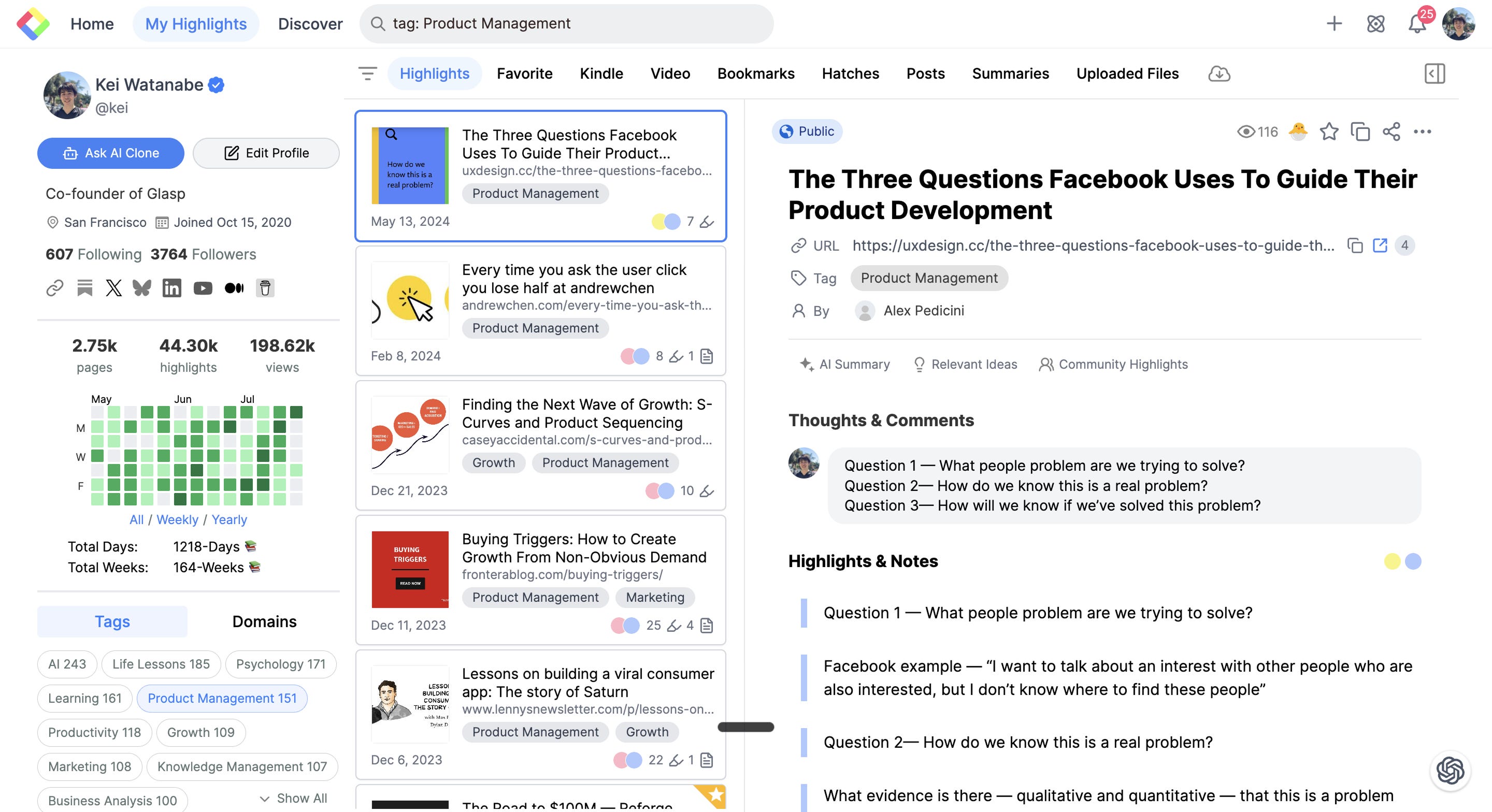 Our founders had backgrounds in product management and development, which meant we often consumed a lot of content on product management, product strategy, UX, and engineering. We used Glasp heavily to highlight these types of articles.