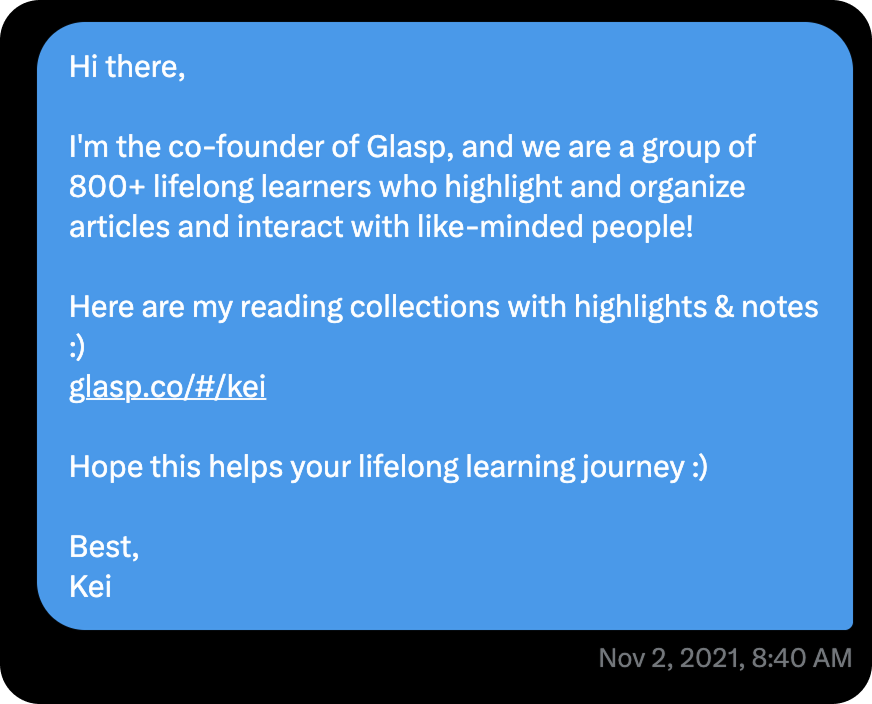 From day one, we didn’t know who would use Glasp. Glasp was born from our own needs as founders, people who love learning, highlighting articles, and organizing knowledge. So, we started with people like us.