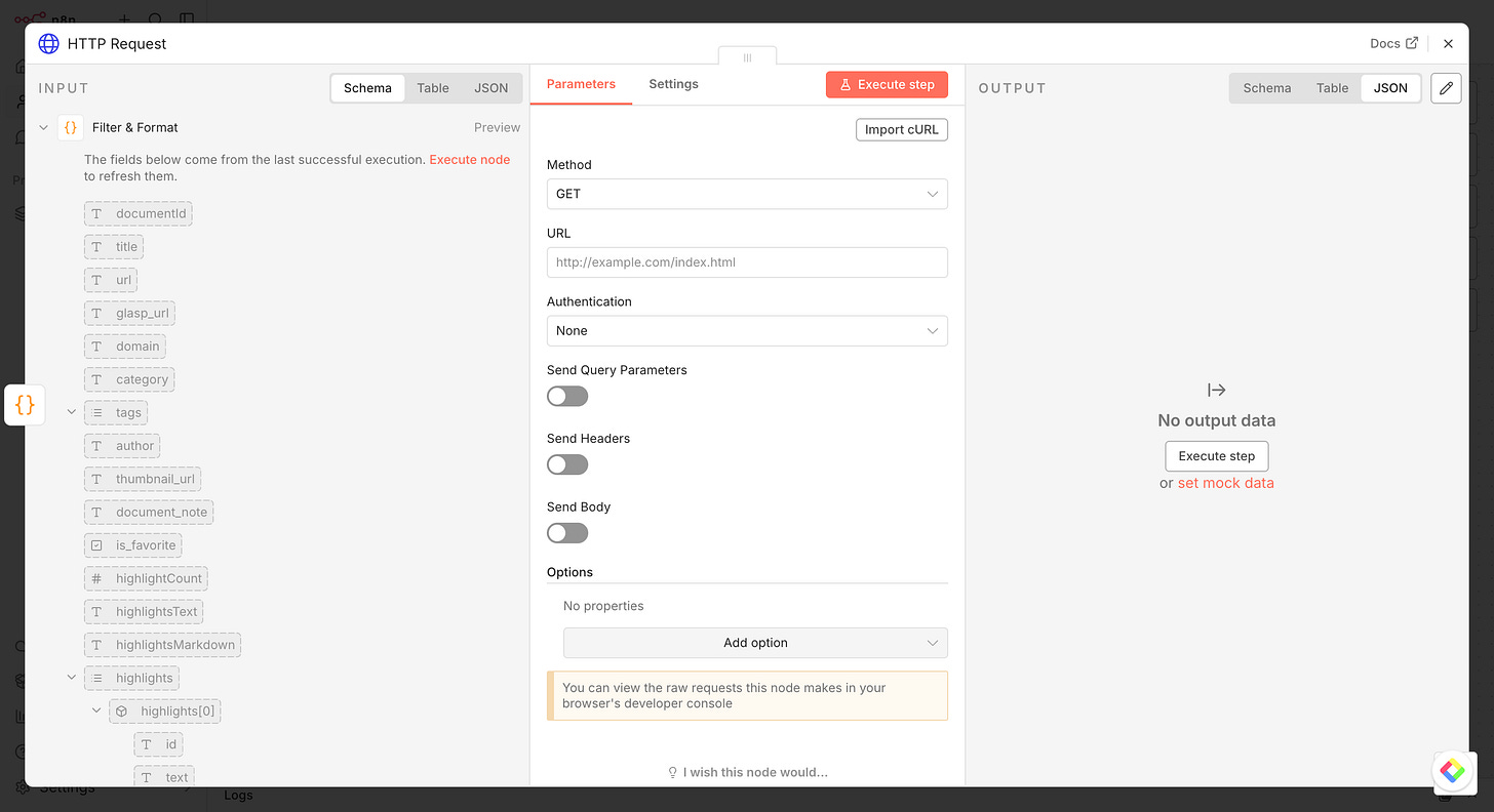 Using n8n, a powerful open-source workflow automation tool, you can build a fully automated pipeline that fetches your latest highlights from Glasp and sends them wherever you need.