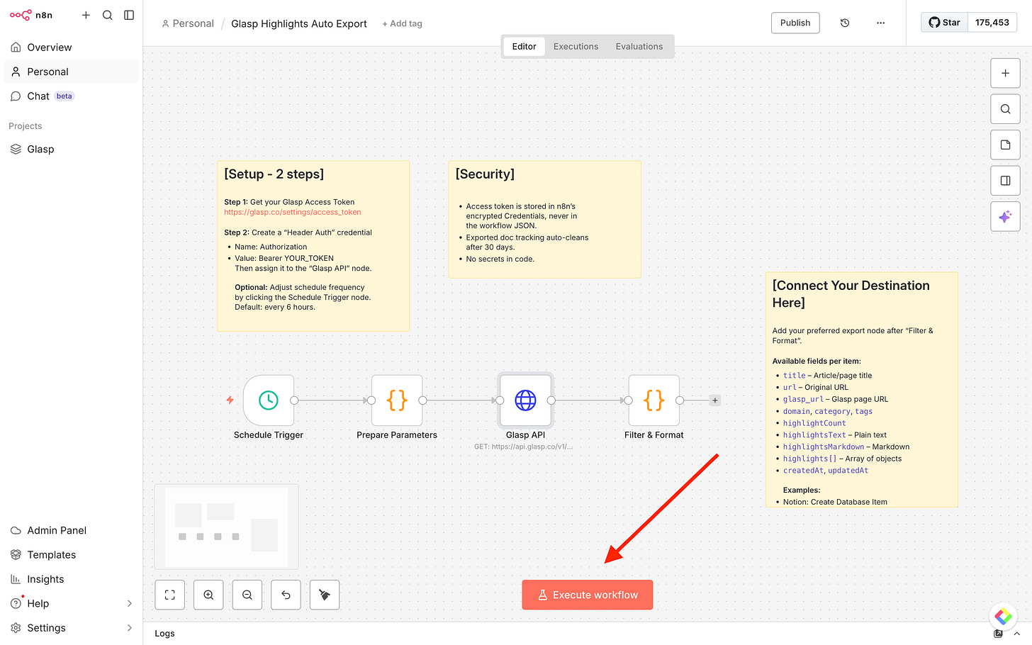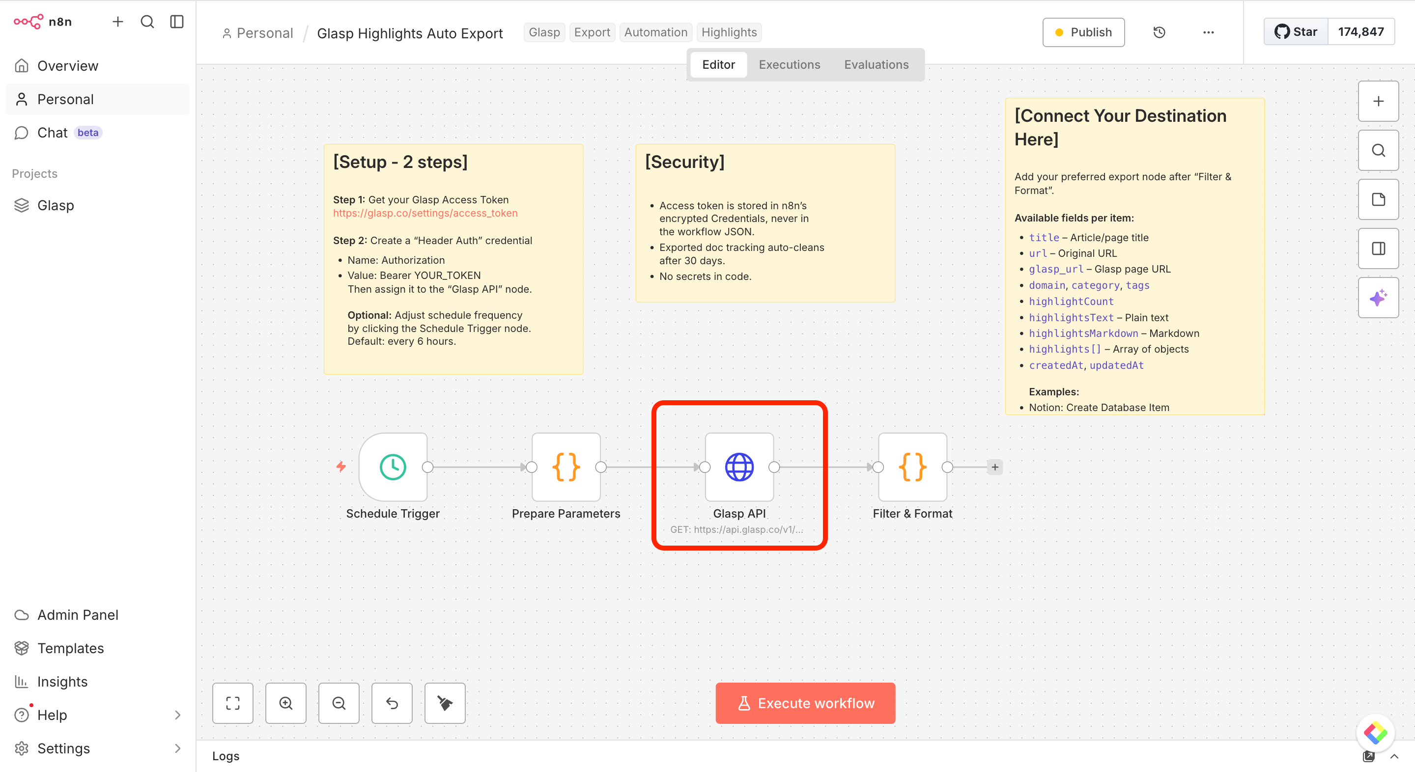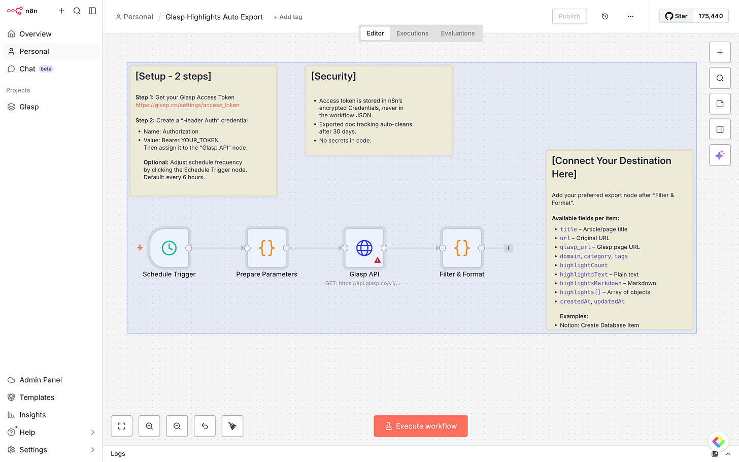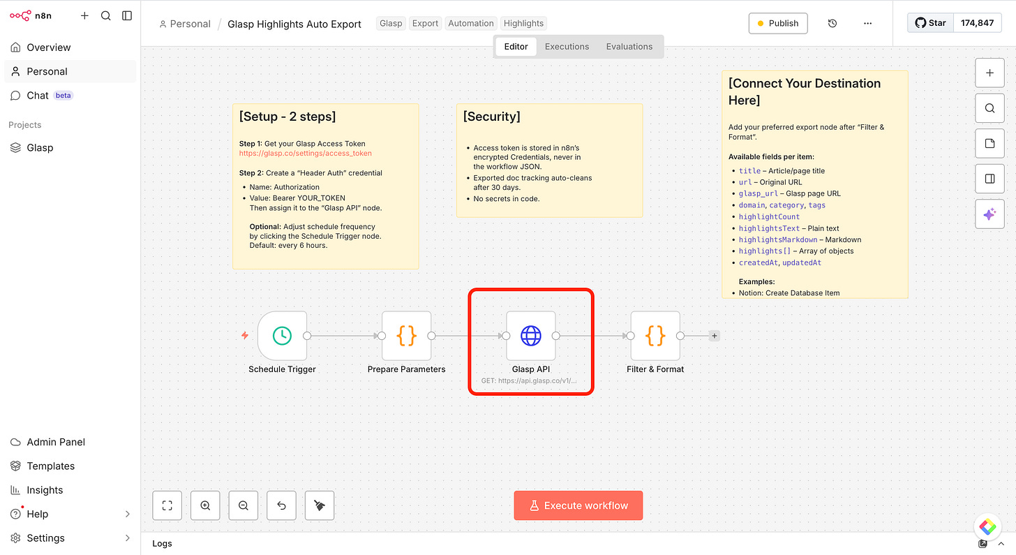 In this tutorial, we’ll walk you through how to import a ready-to-use workflow, configure your Glasp API credentials, and connect your favorite destinations — so your highlights flow automatically into the tools you already use.