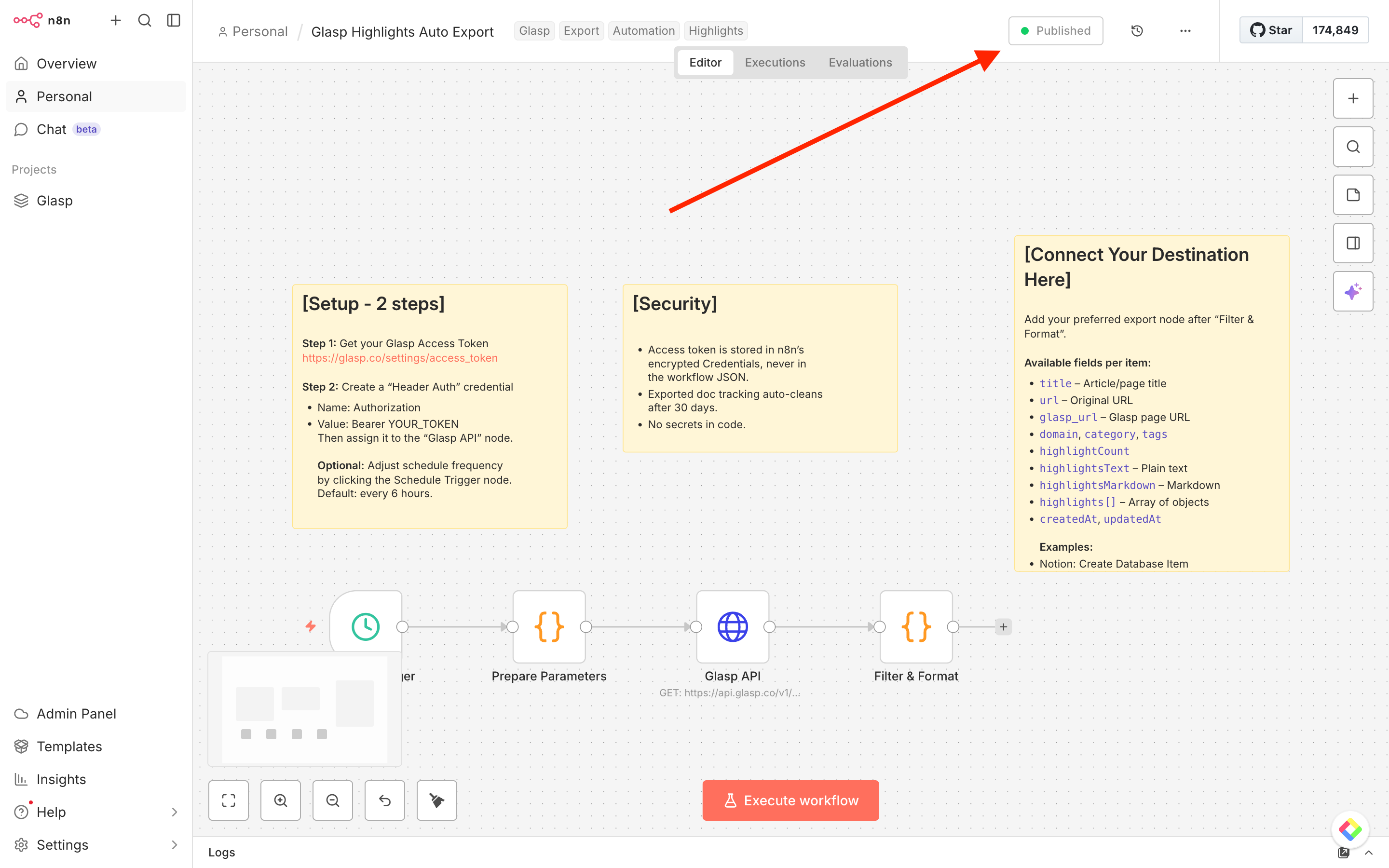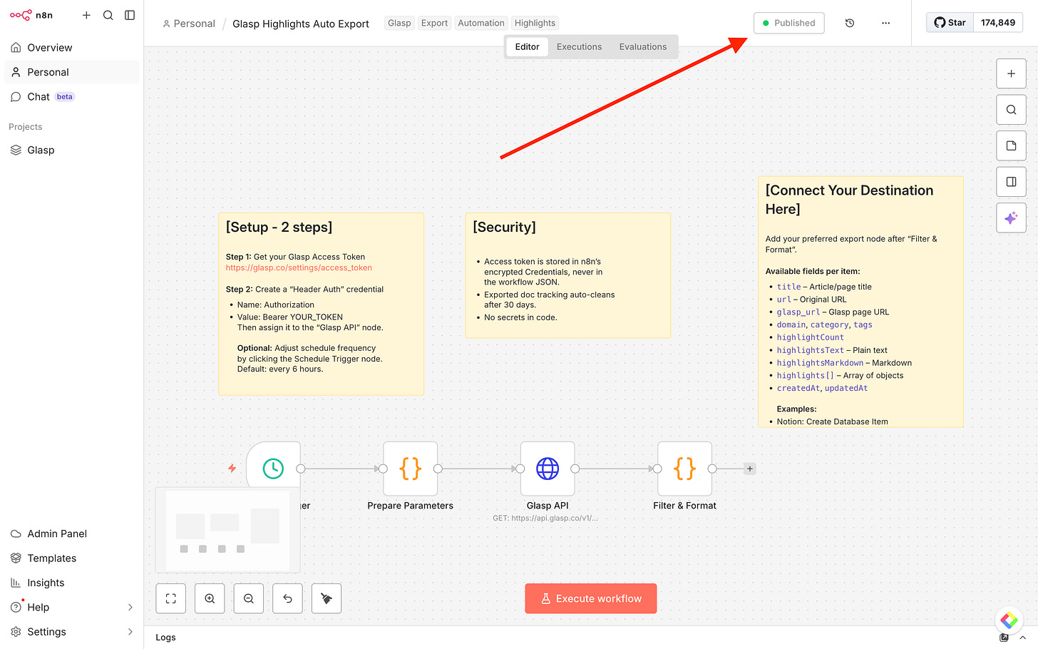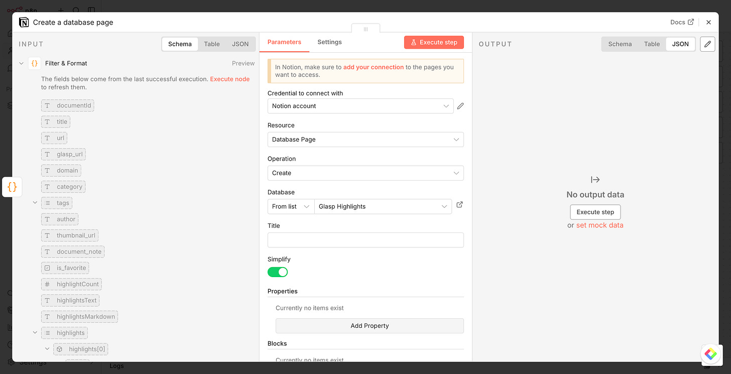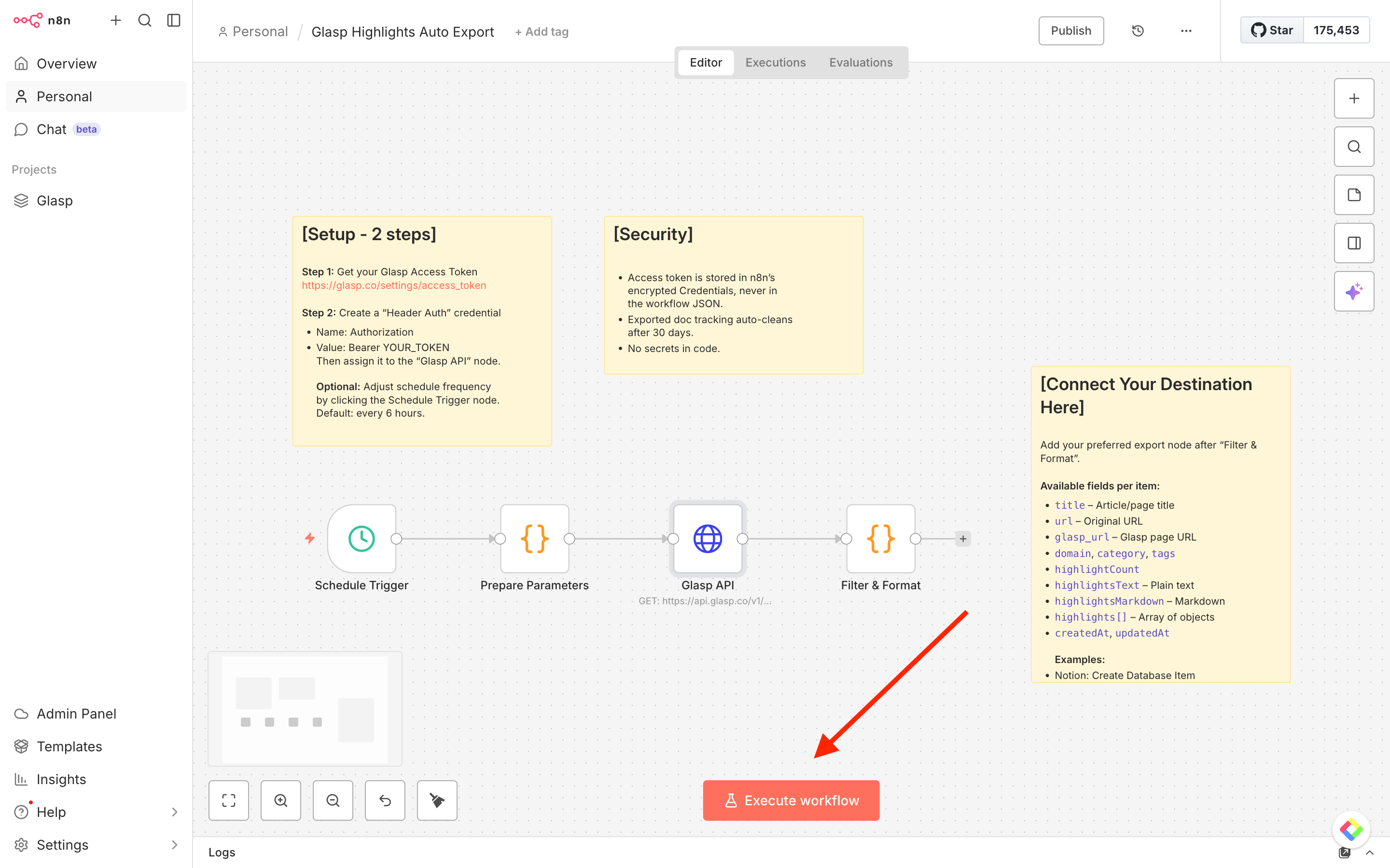 In this tutorial, we’ll walk you through how to import a ready-to-use workflow, configure your Glasp API credentials, and connect your favorite destinations — so your highlights flow automatically into the tools you already use.
