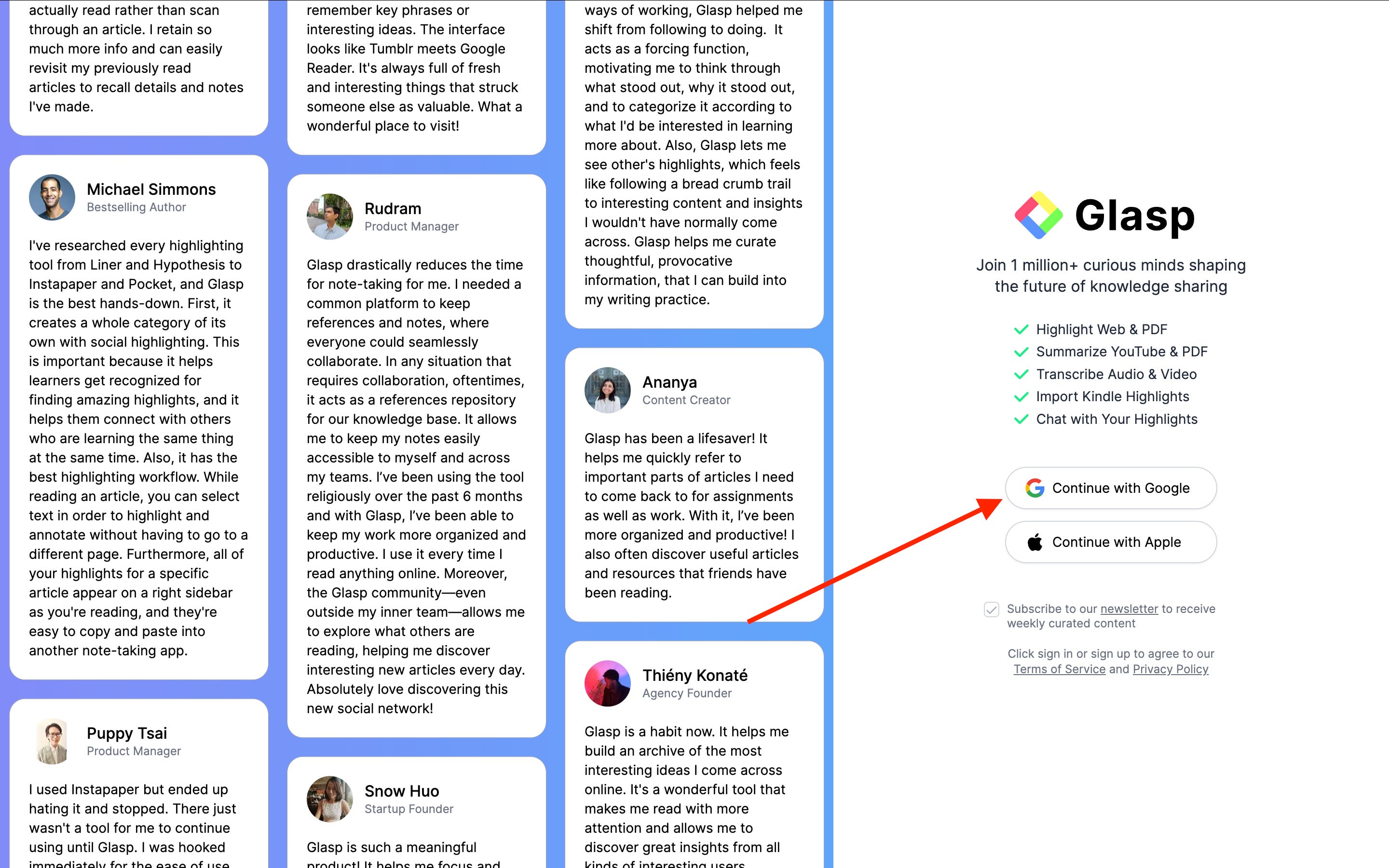 You can sign up for Glasp with either Google Sign-in or Apple Sign-in. If you’re not an iPhone/iPad user, we strongly recommend you use Google Sign-in.