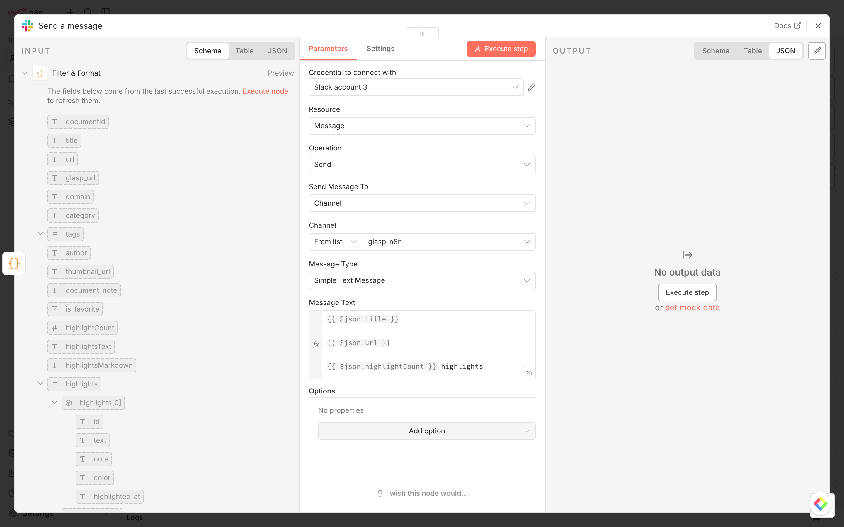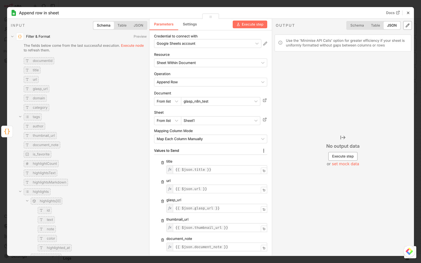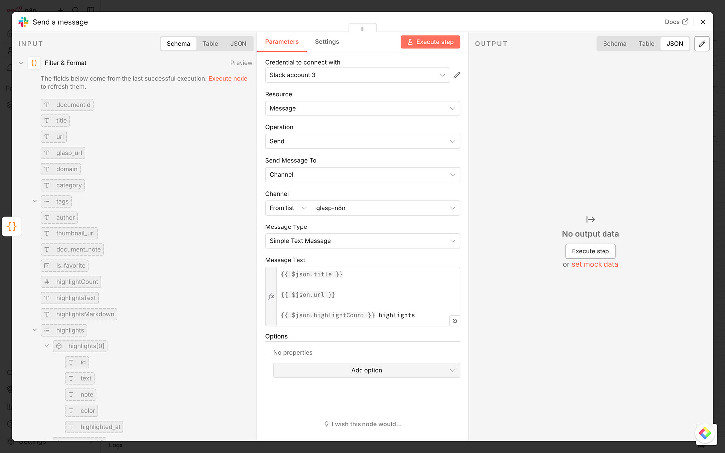 Click Execute Workflow at the bottom of the canvas. If everything is set up correctly, you should see your recent highlights flowing through each node.