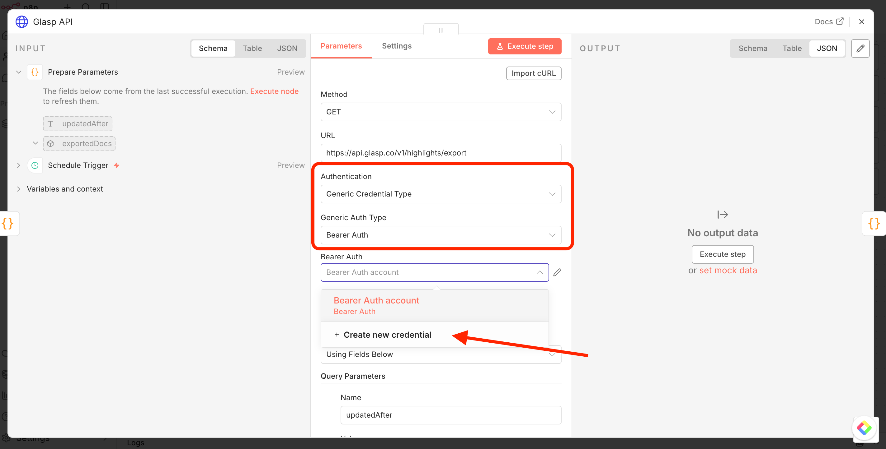 In the credential modal, paste your Glasp access token into the Bearer Token field