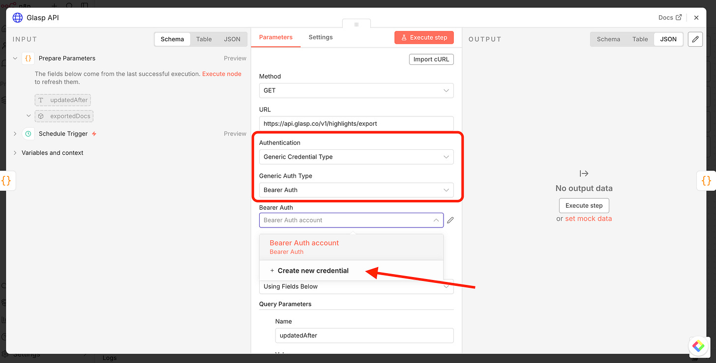 Once the workflow is imported, you need to add your Glasp credentials.
