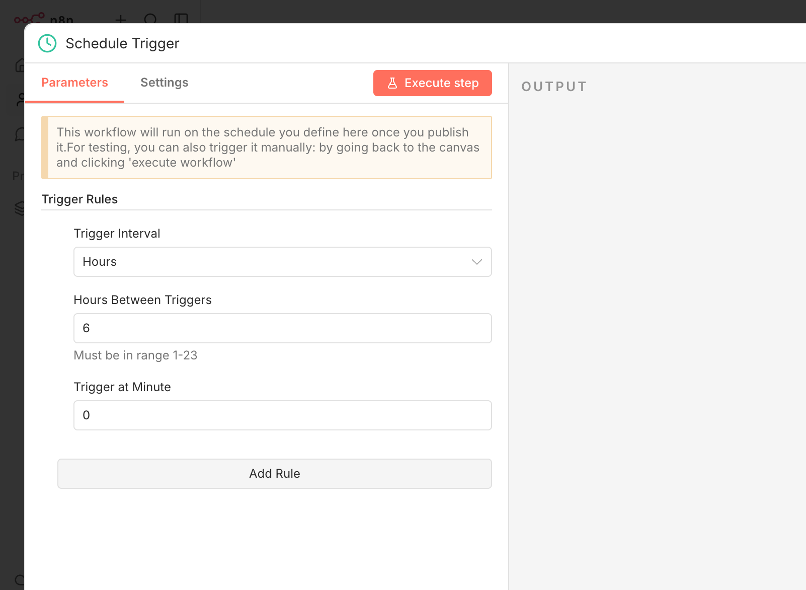 Once you’ve tested everything and connected your destination, click Publish (top-right). The workflow is now active and will run automatically every 6 hours. You can change the frequency by clicking the Schedule Trigger node.