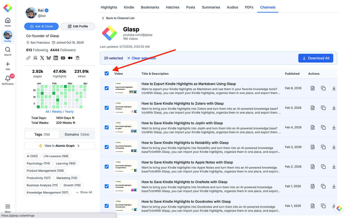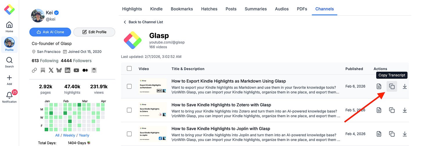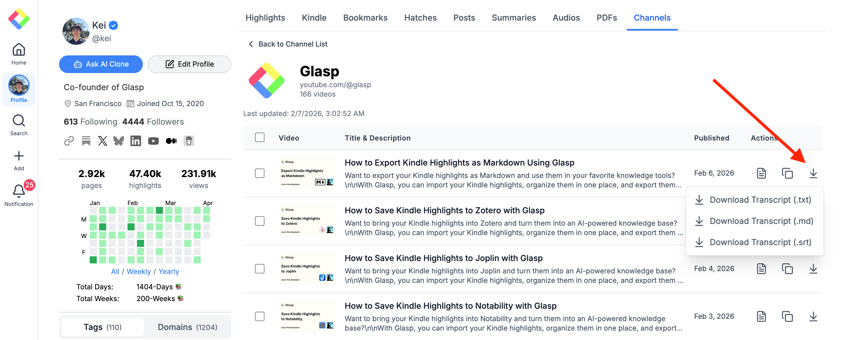 With Glasp’s YouTube Channel Tracking, you can connect your channel, bulk download all your transcripts, and turn your videos into reusable knowledge — in the format of your choice.