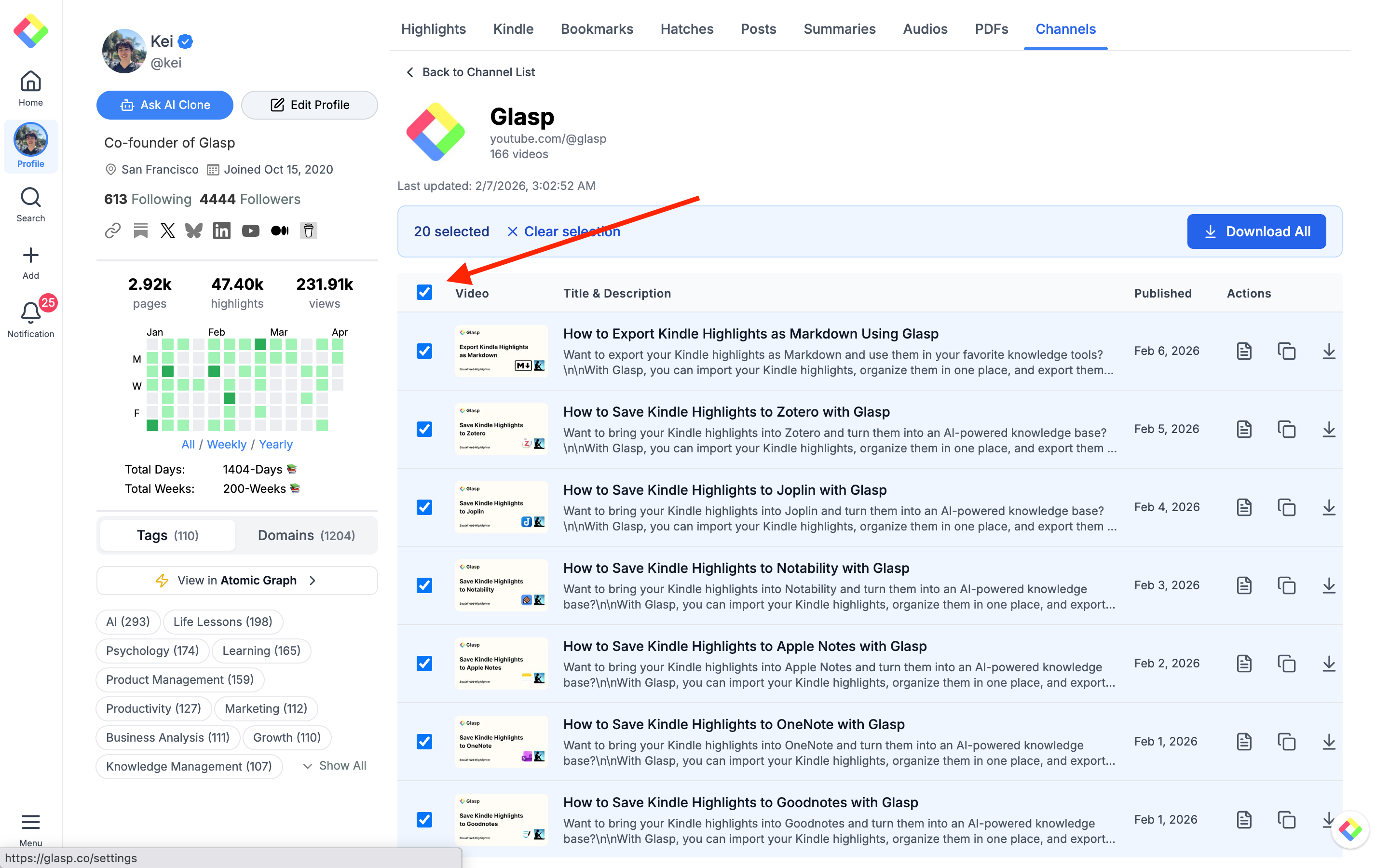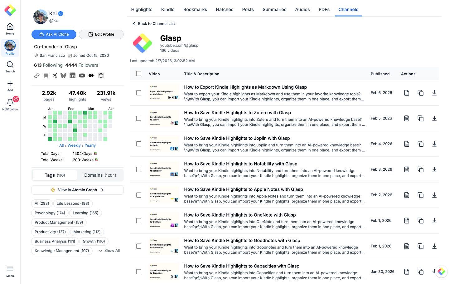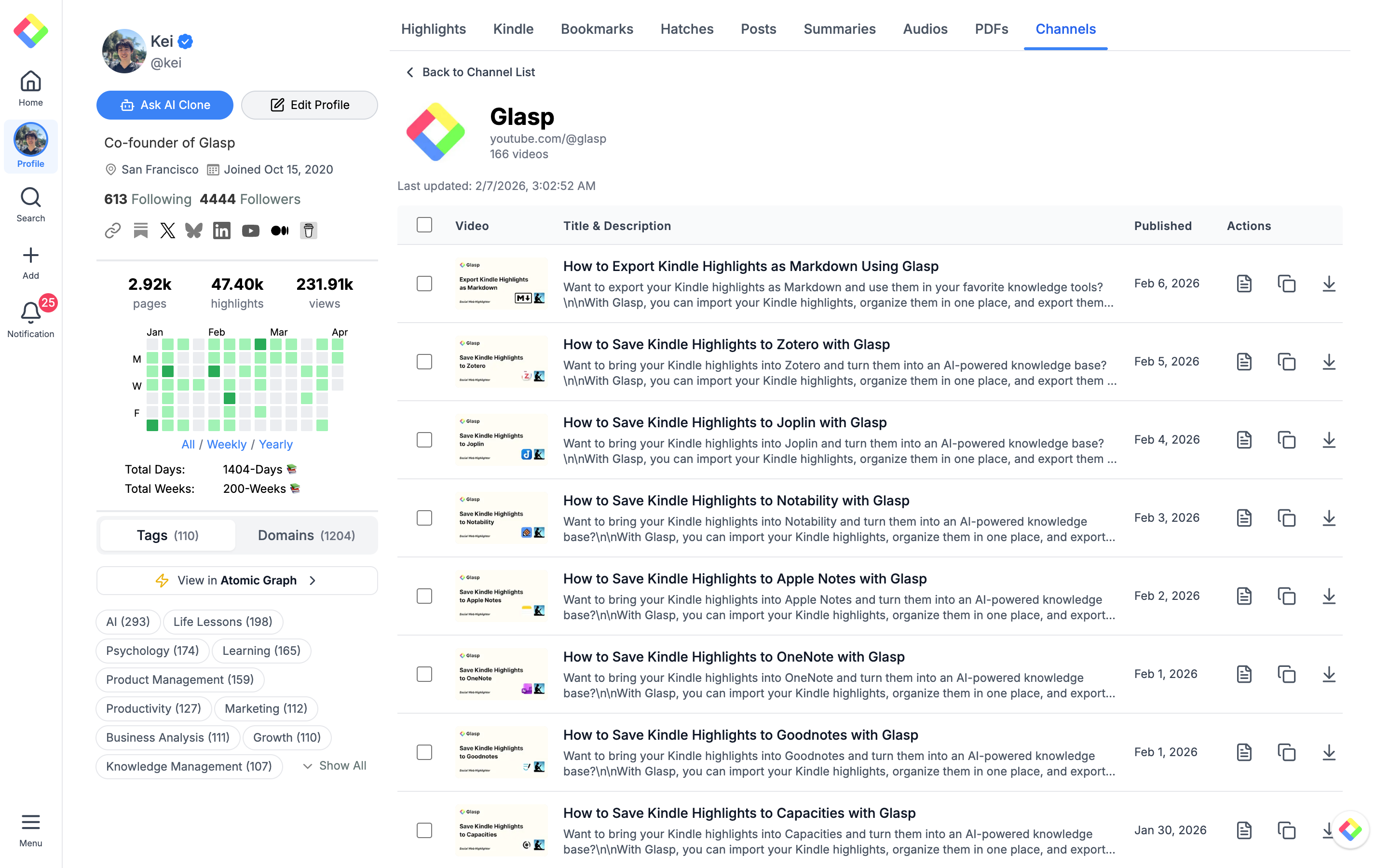 With Glasp’s YouTube Channel Tracking, you can connect your channel, bulk download all your transcripts, and turn your videos into reusable knowledge — in the format of your choice.