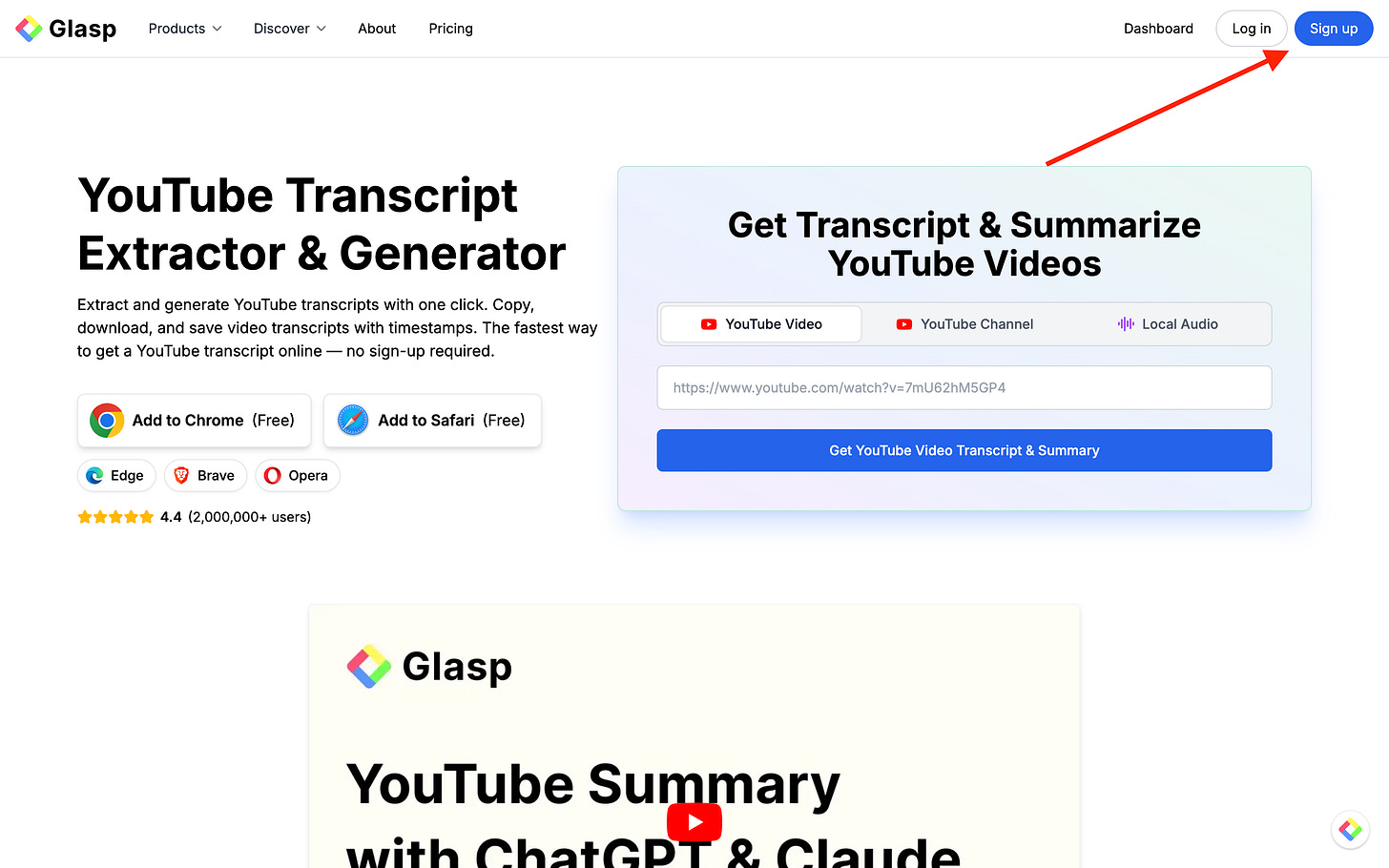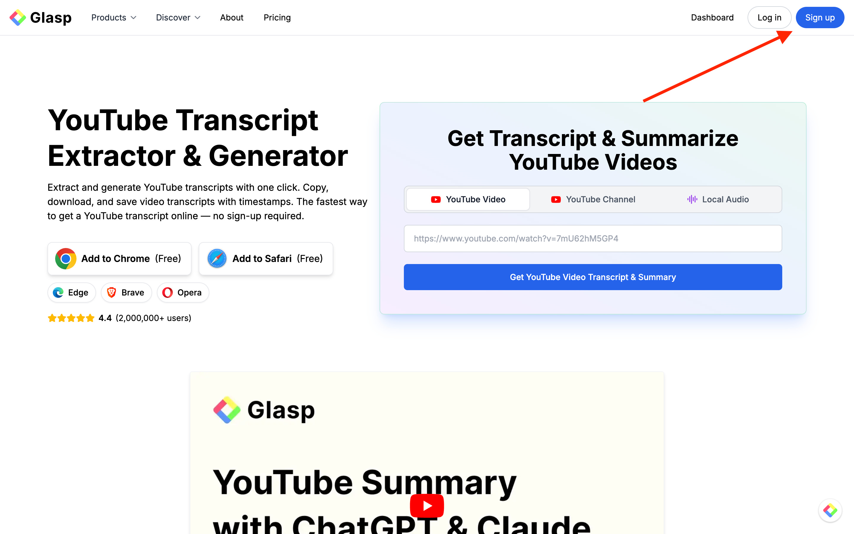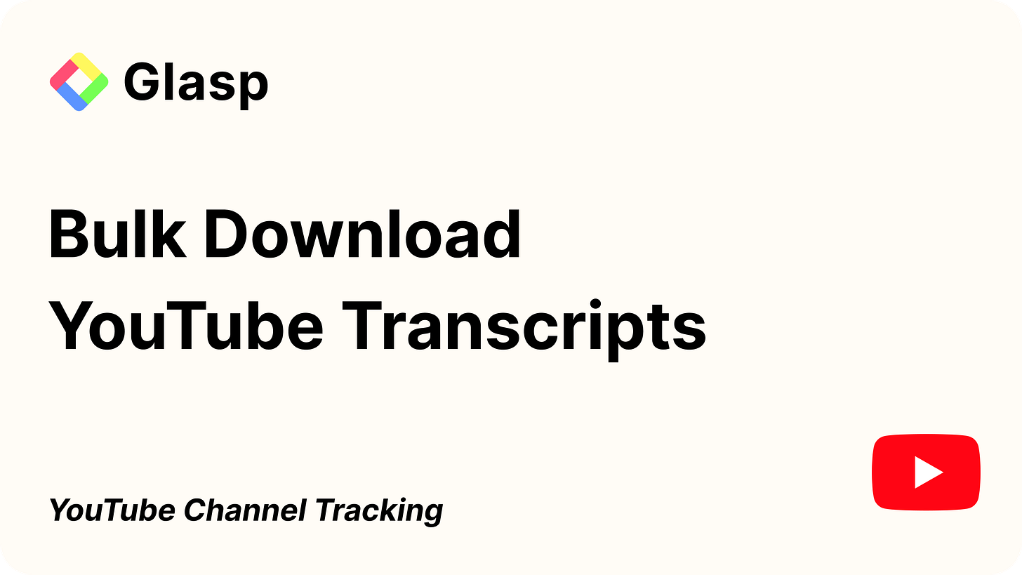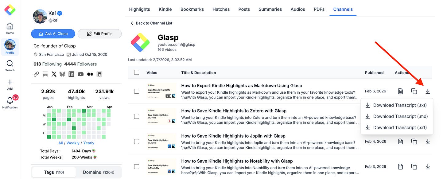 Glasp lets you bulk download transcripts from your own YouTube channel — automatically syncing all your videos so you can export them at once, in the format of your choice.