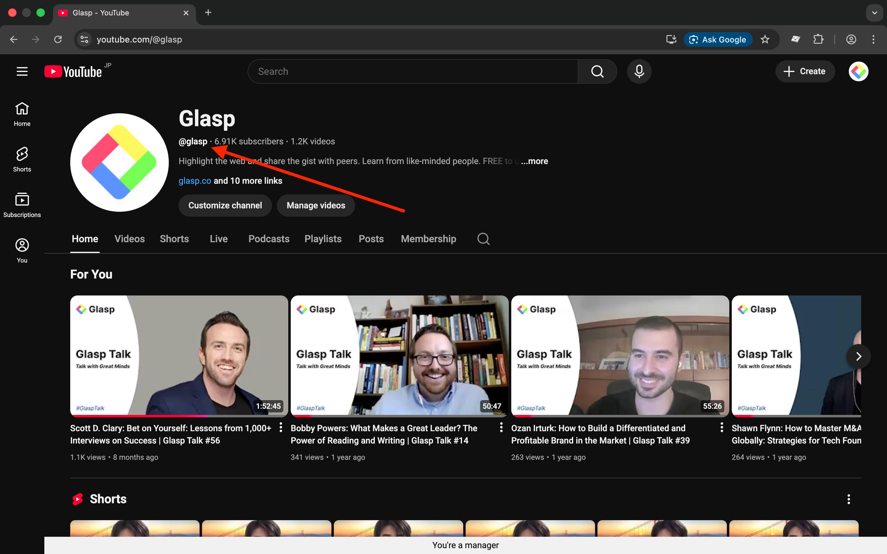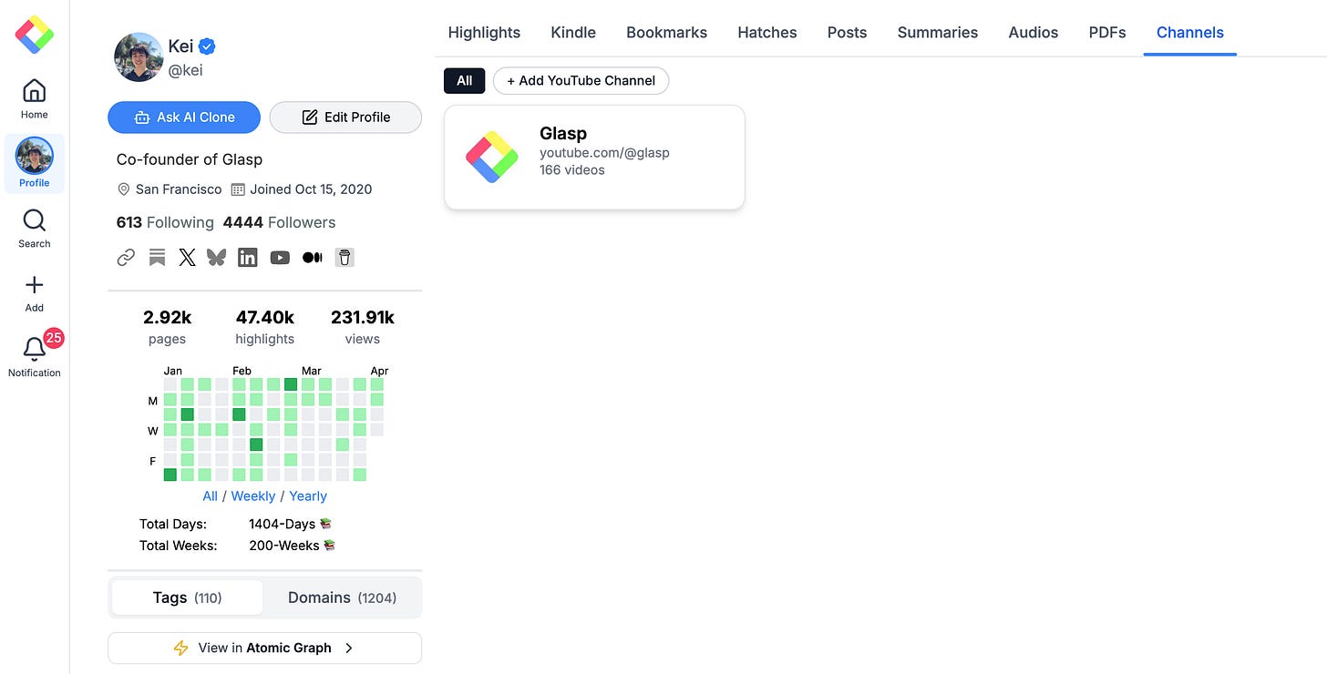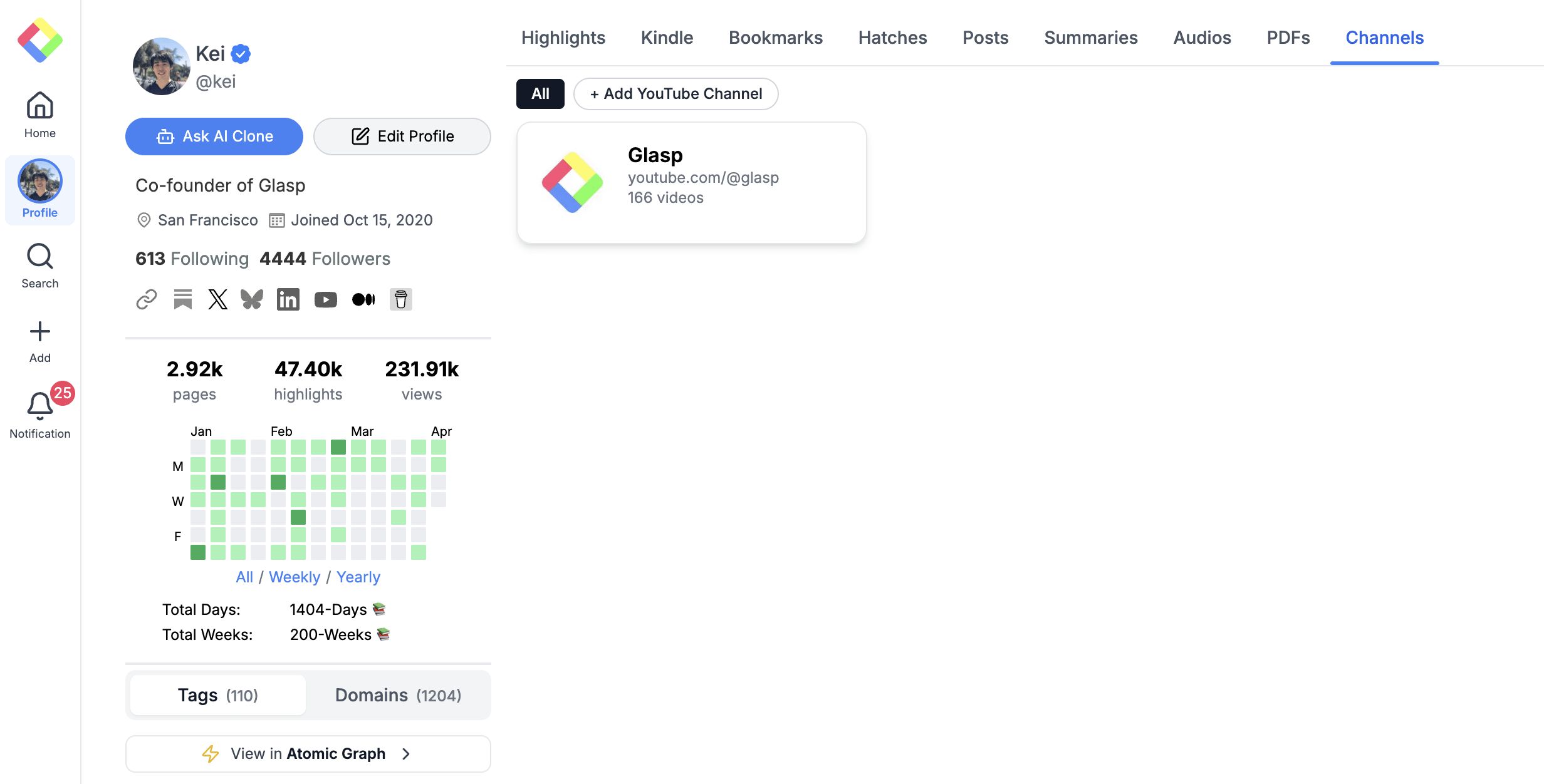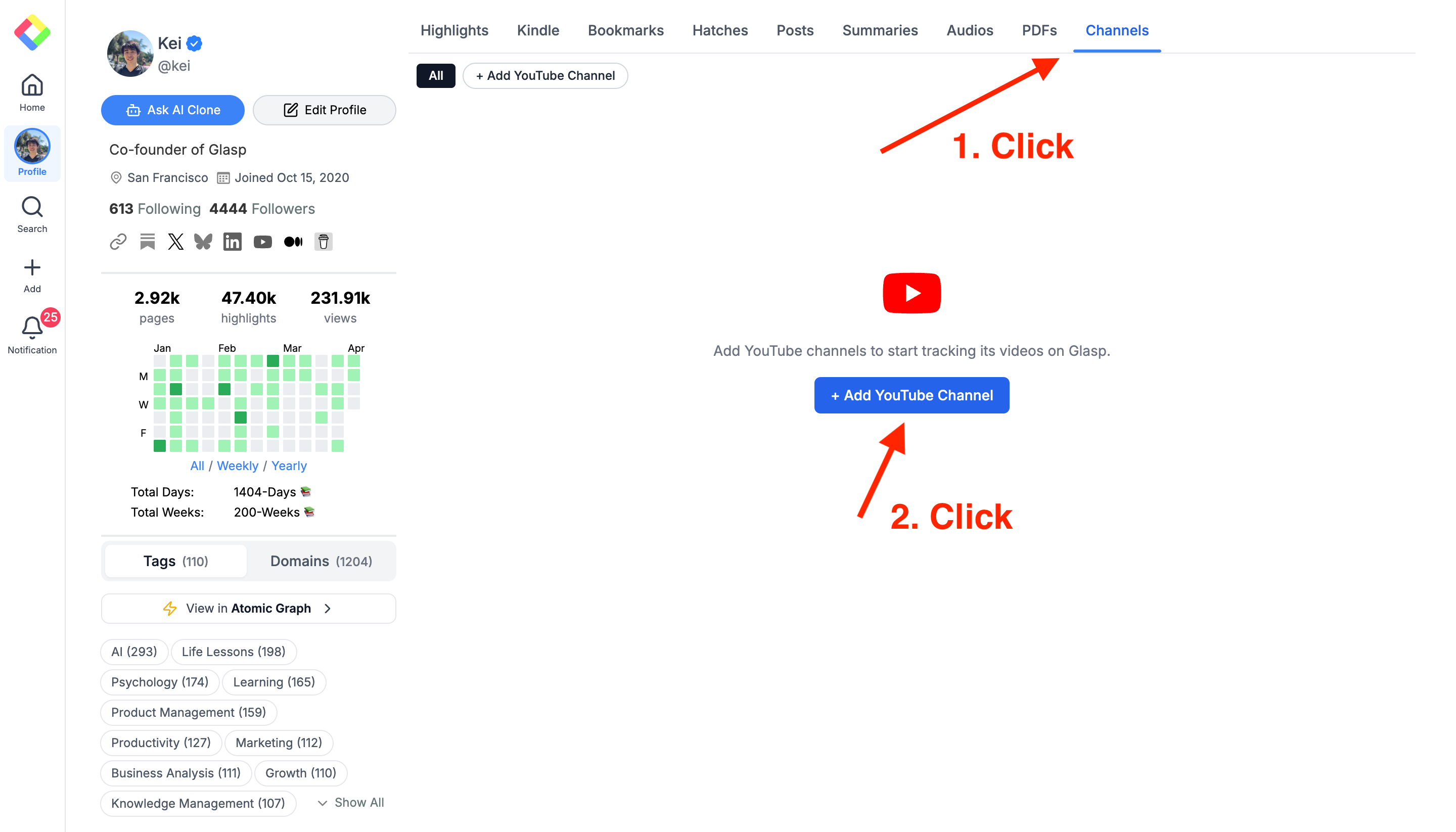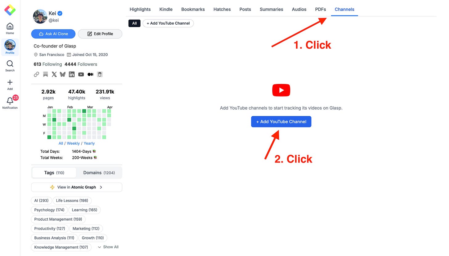 On your Glasp profile page, click the Channels tab at the top. Then, click “+ Add YouTube Channel.”