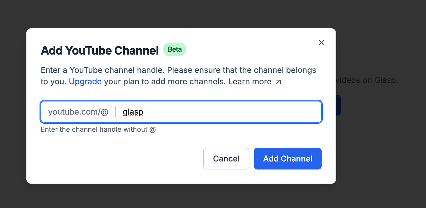After you click “Add Channel,” Glasp will connect your channel and start syncing all your public videos.