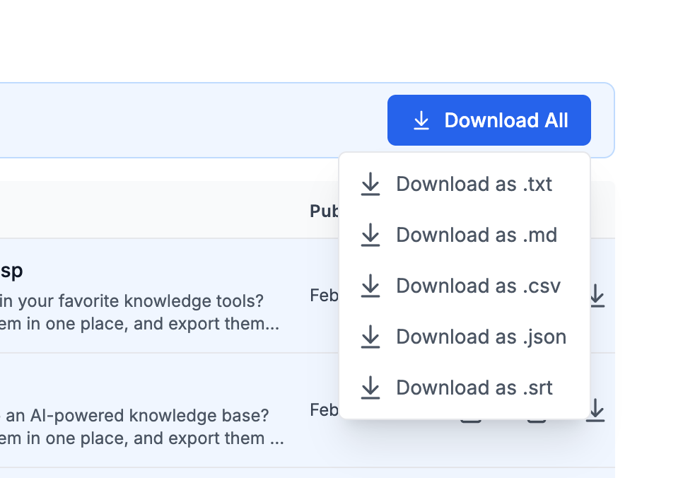 Download transcripts in bulk — .txt, .md, .csv, .json, or .srt