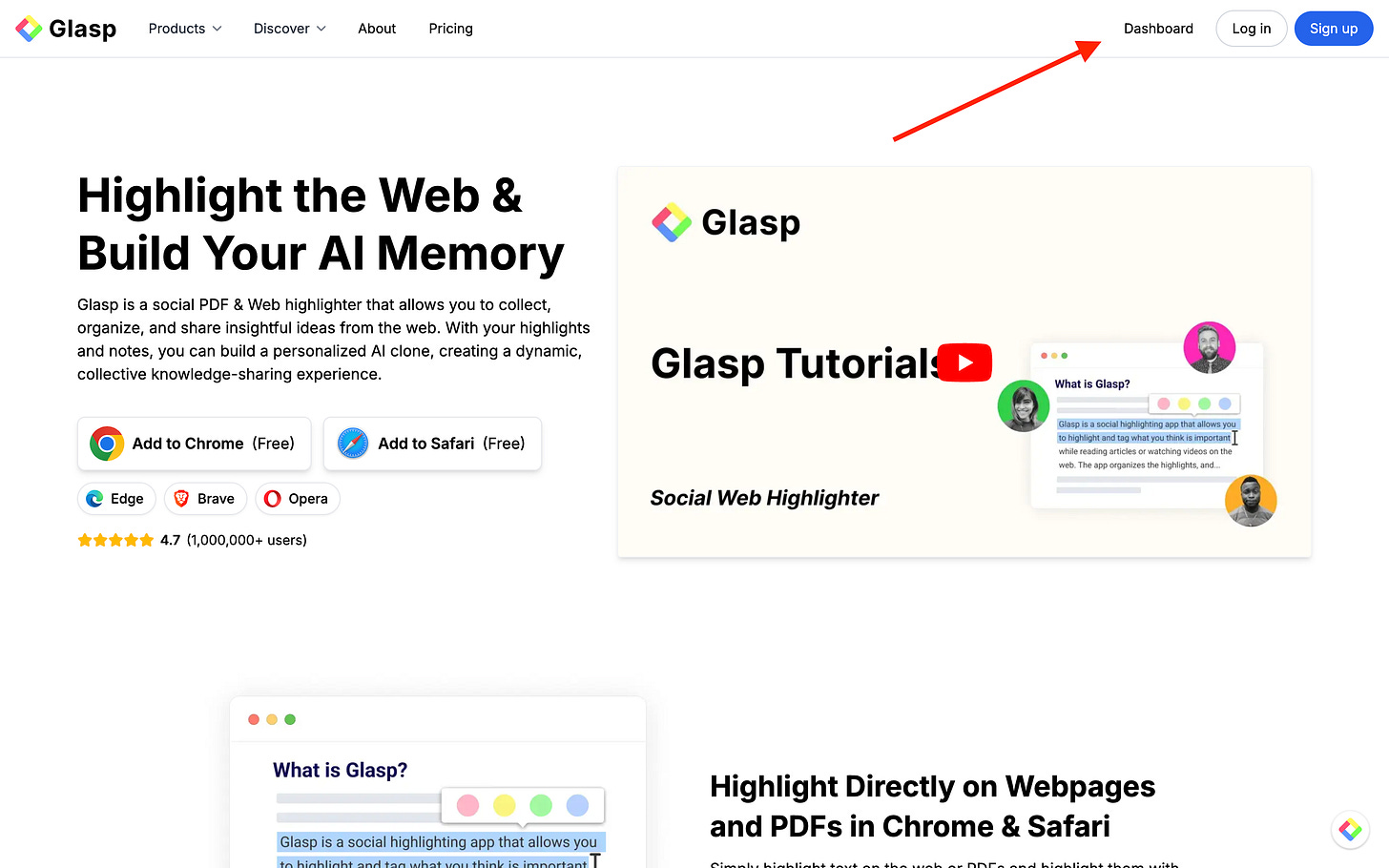 After finalizing your account, please go to your profile page by clicking “Dashboard” at the top right. If you cannot see the "Dashboard," please visit glasp.co again.