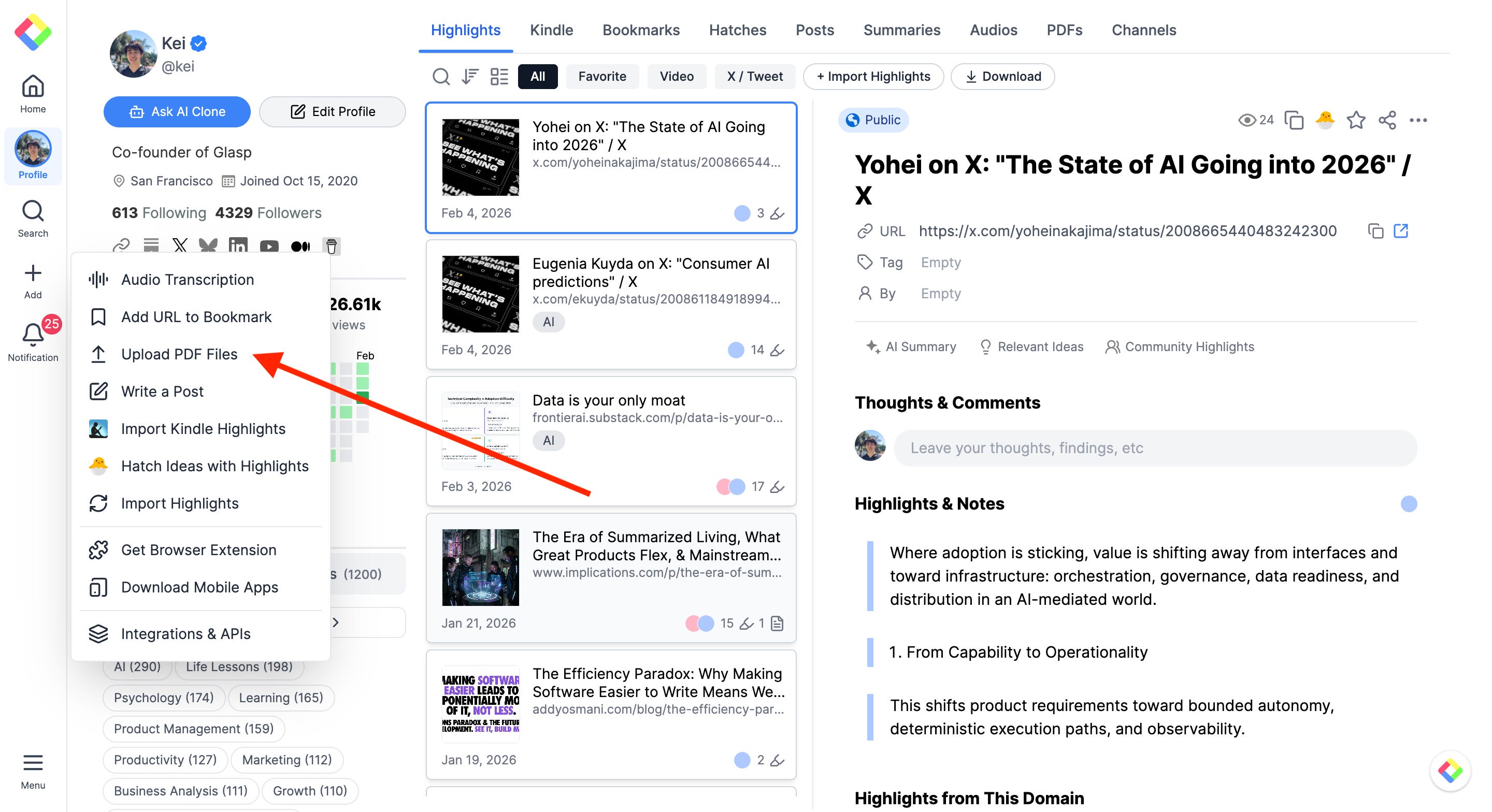 With this feature, you can upload your local PDF files directly to Glasp, highlight important passages as you read, and instantly generate AI-powered summaries. Beyond highlighting, Glasp helps you turn PDFs into reusable knowledge you can search, organize, and reuse across your tools.