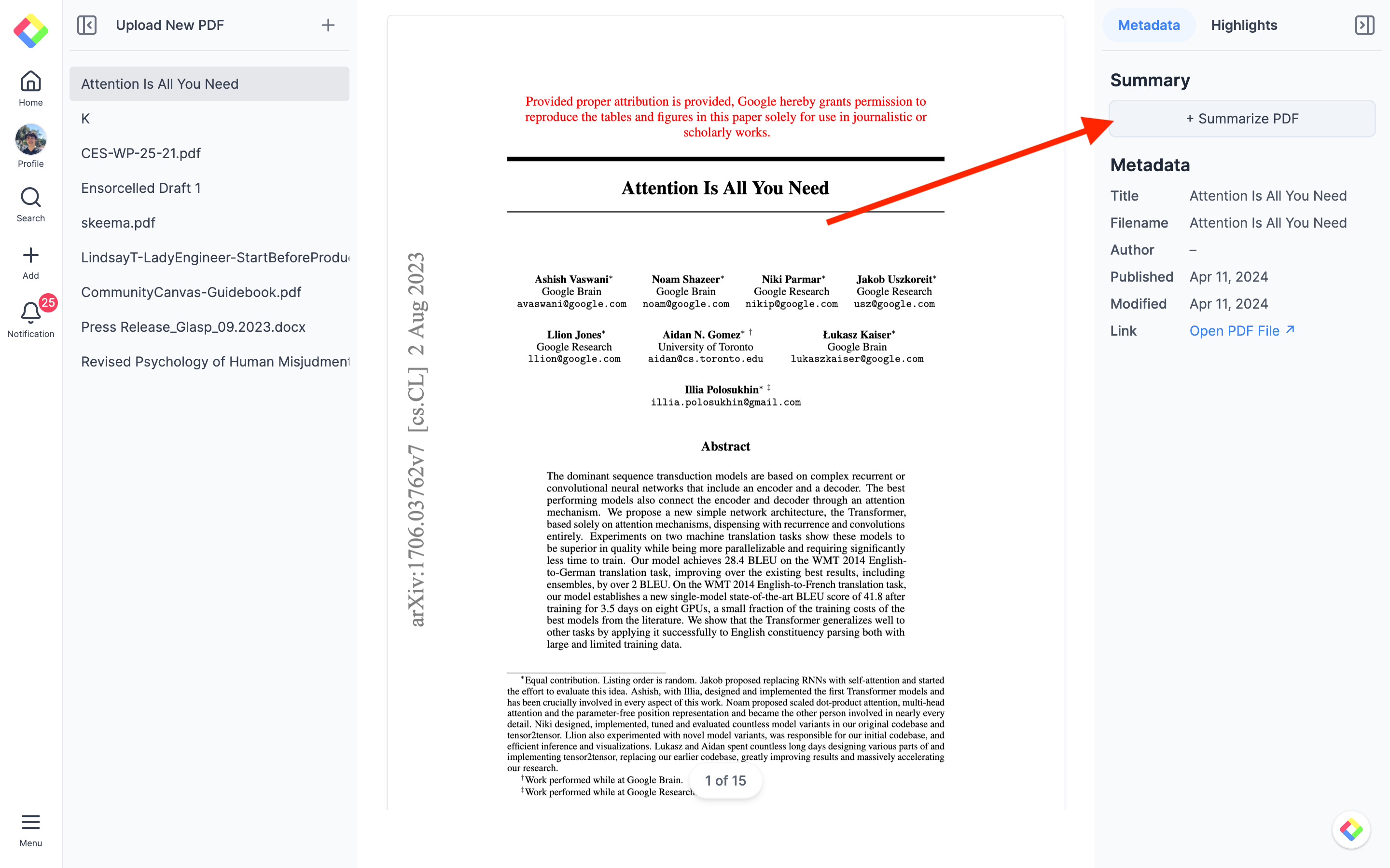 To generate an AI summary of the PDF, click Summarize PDF in the top-right corner.