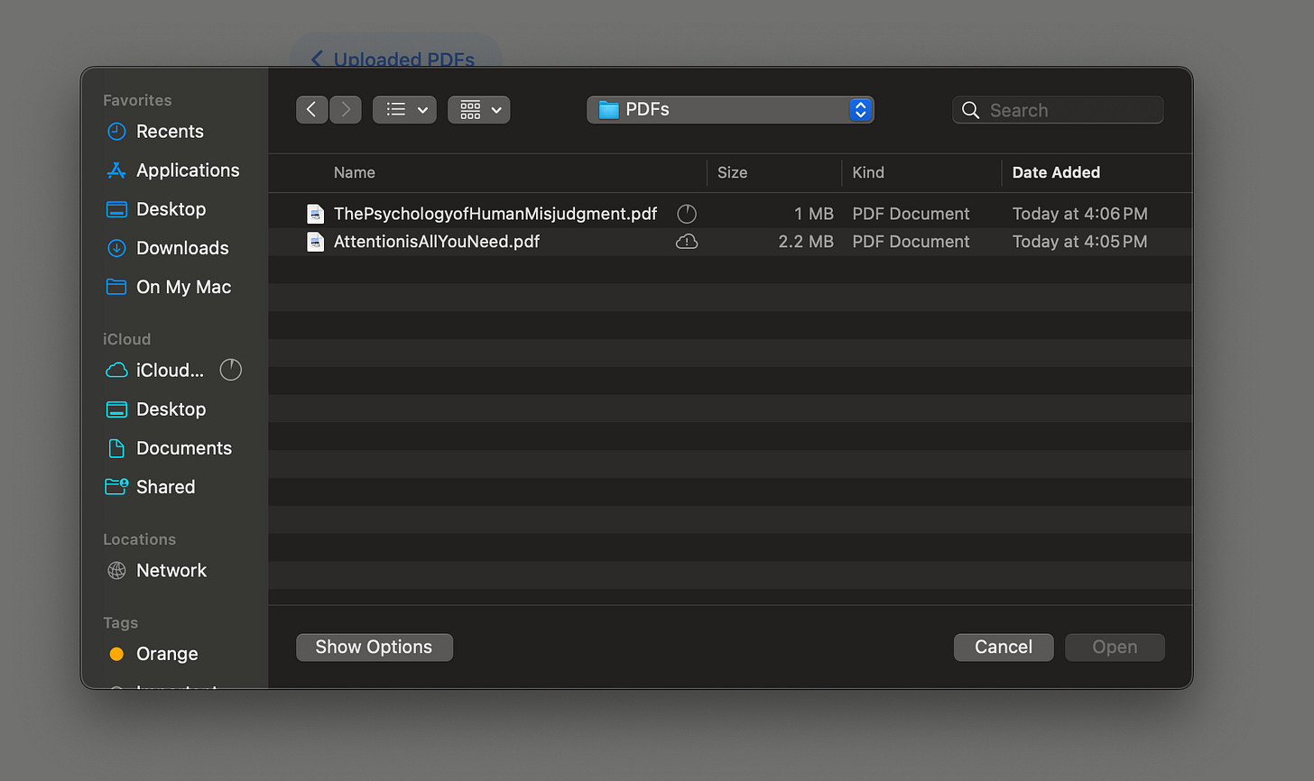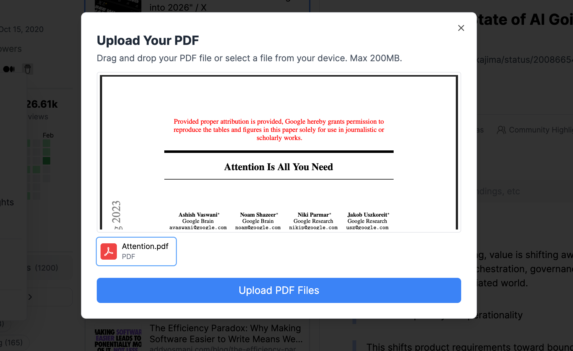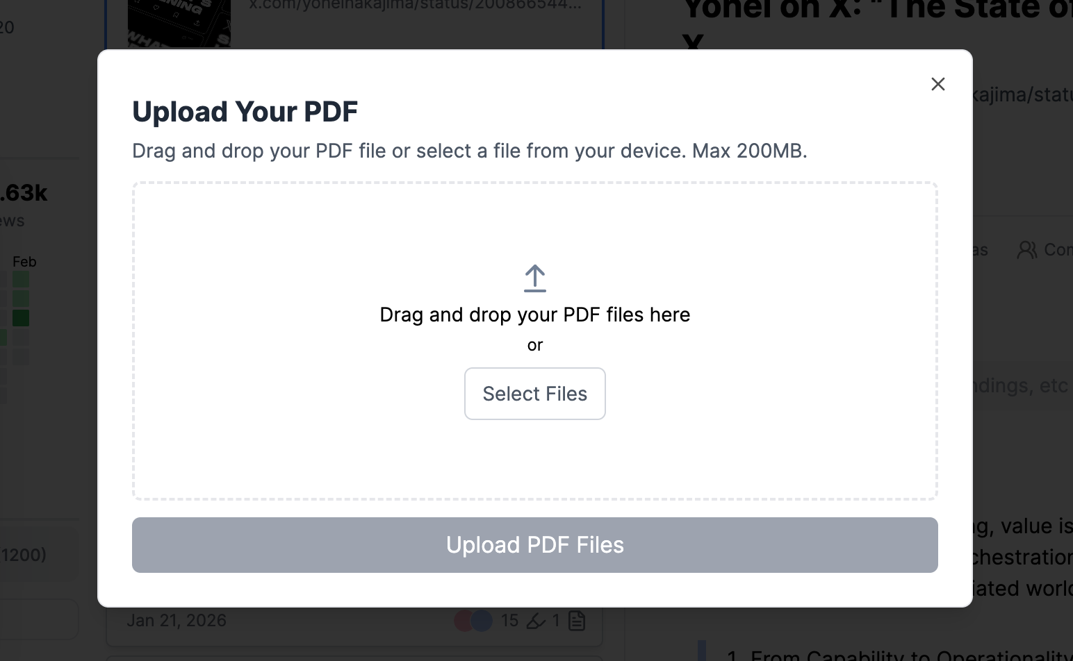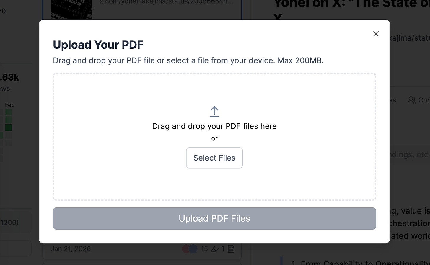 After selecting a PDF file, click Upload PDF Files in the modal. Your PDF will begin uploading to Glasp.