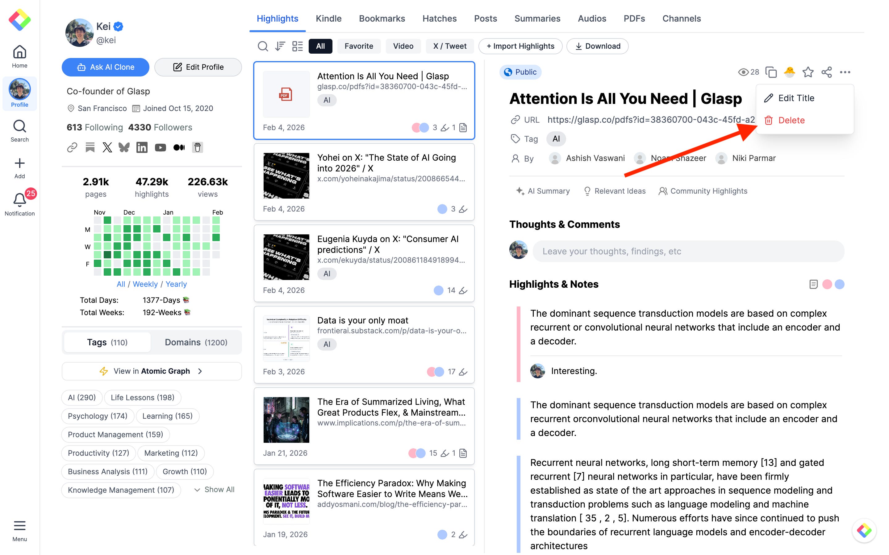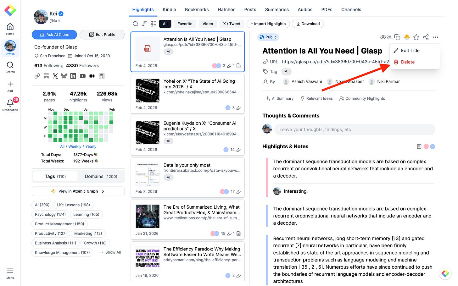 To delete highlights from your Glasp profile, go to your profile page and select the PDF. Click the three-dot menu in the top-right corner, then choose Delete to remove the highlights.