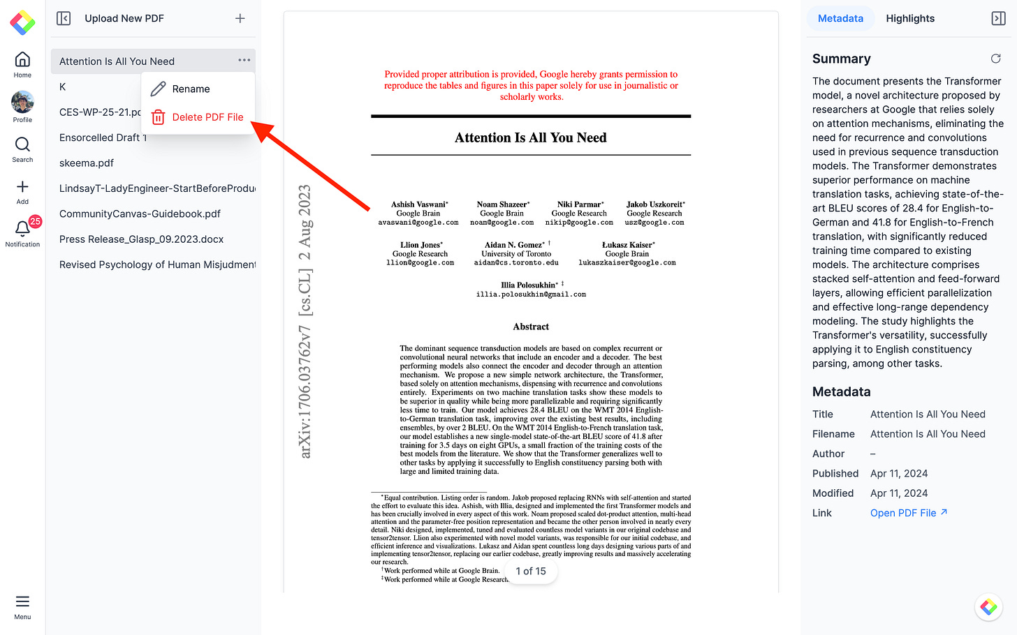 To delete an uploaded PDF, go to the page showing all your uploaded PDFs.