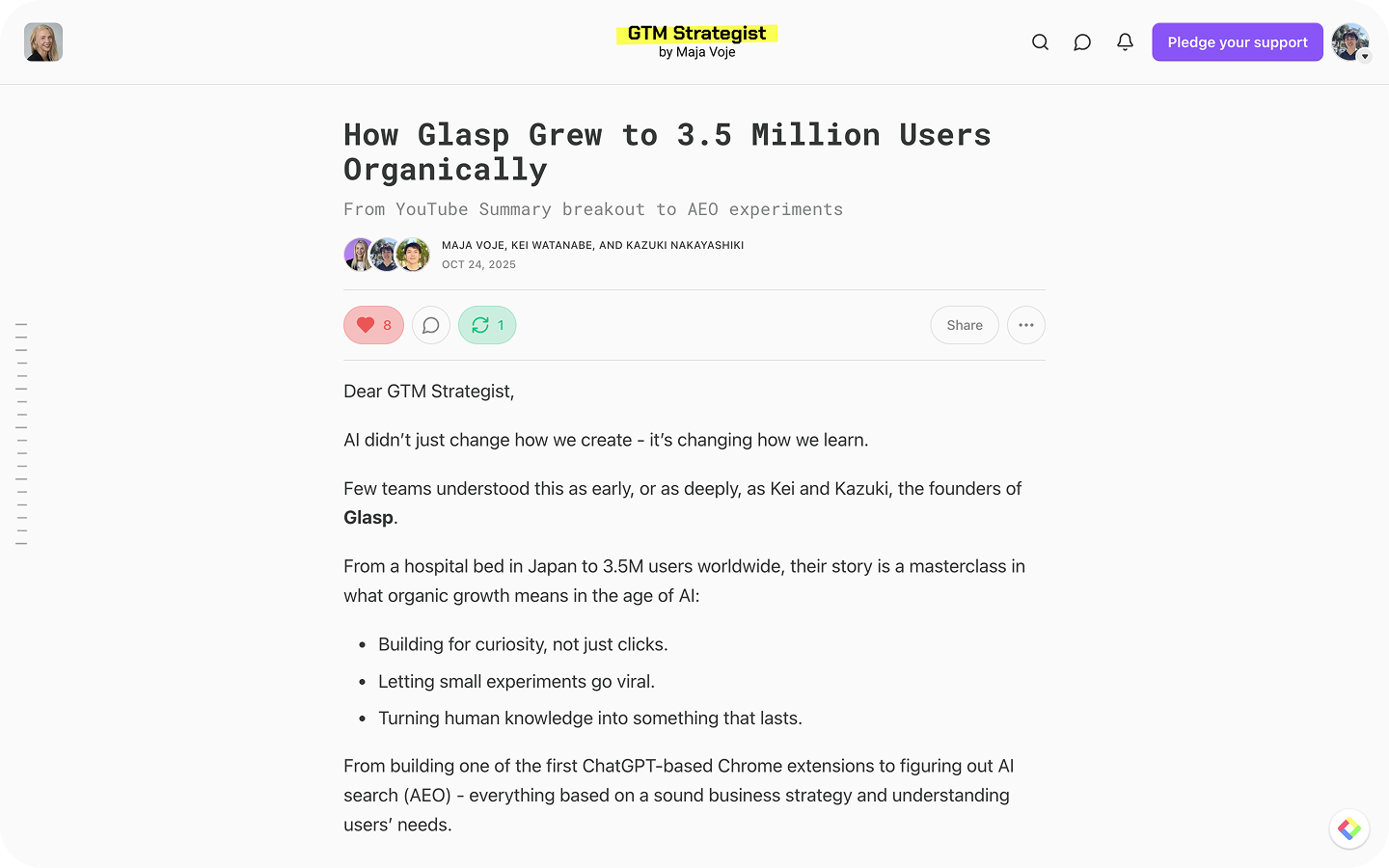 We contributed a guest post to , where we shared our founding story and the growth strategies that helped us reach 3.5 million users. It was a pleasure to collaborate again with , who previously joined us on Glasp Talk. Huge thanks to Maja for the opportunity — here’s the full story.