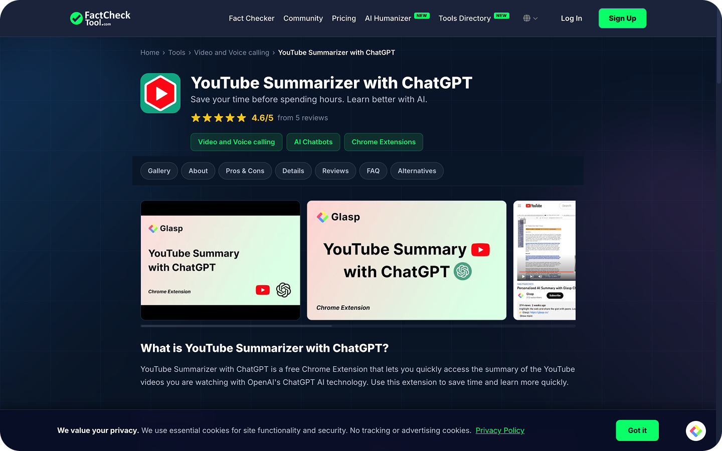 YouTube Summarizer with ChatGPT on FactCheckTool.com