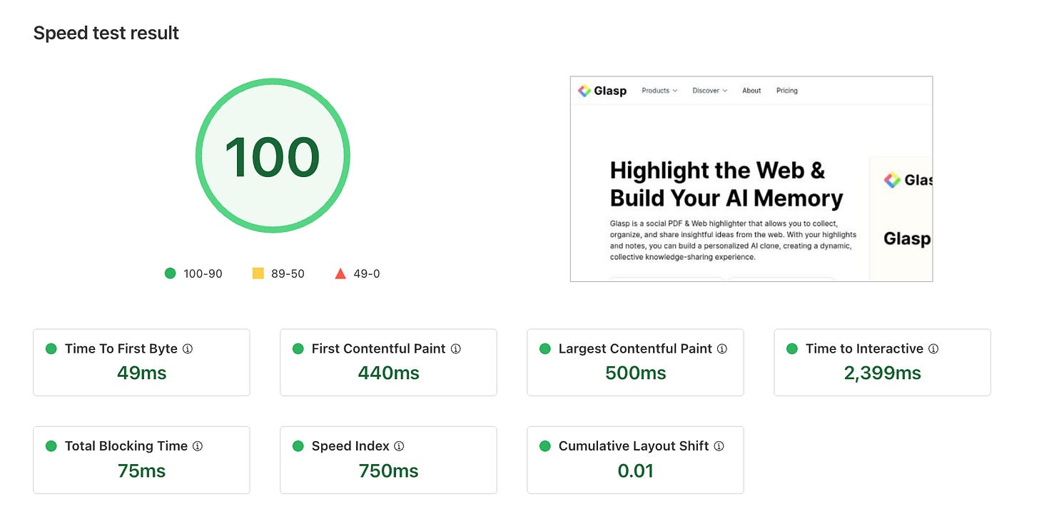 We’ve refactored the Glasp website and optimized every detail. Pages now load in just a few hundred milliseconds, and we’re proud to have achieved a perfect score of 100⚡️ If you encounter any issues, please let us know.🟨 emoCAPTCHA: