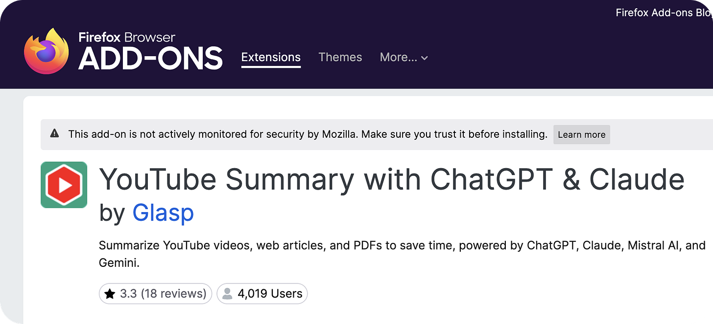🟥 YouTube Summary’s Firefox Extension Reaches 4,000 Installs: