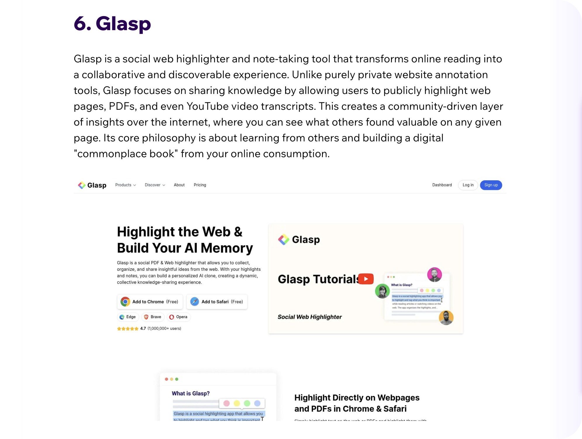 With the Glasp mobile app, you can highlight and organize your favorite content anytime, anywhere. Stay productive on the move and never miss an insightful quote.